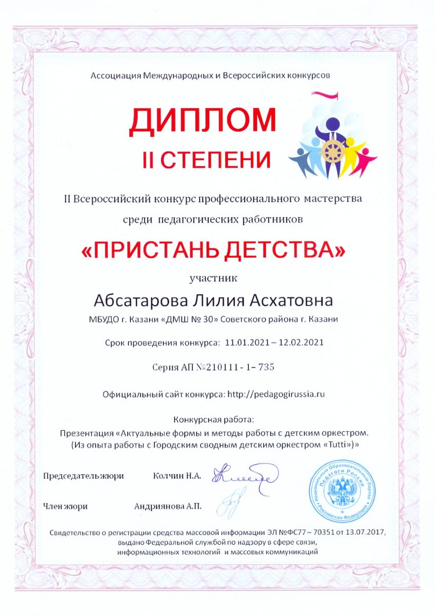 II Всероссийский конкурс профессионального мастерства среди педагогических работников "Пристань детства" - Абсатарова Л.А. - диплом II степени