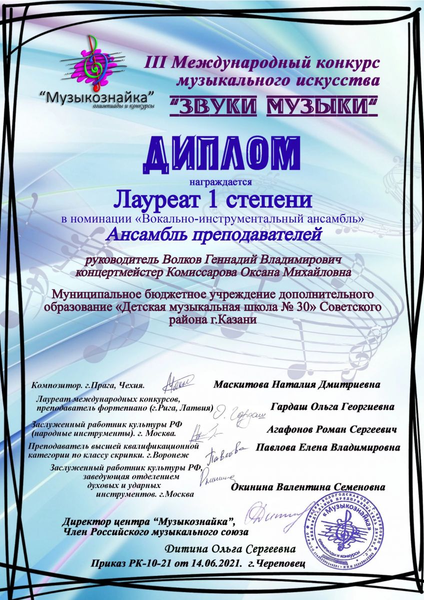 III Меджународный конкурс музыкального искусства "Звуки музыки" - ансамбль преподавателей - I место