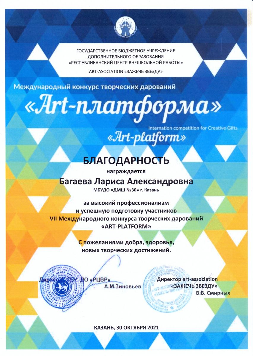 Международный конкурс творческих дарований "Art-платформа" - Багаева Л.А. - Благодарственное письмо