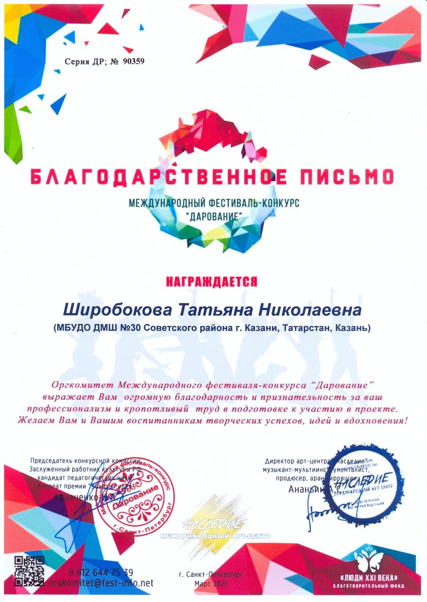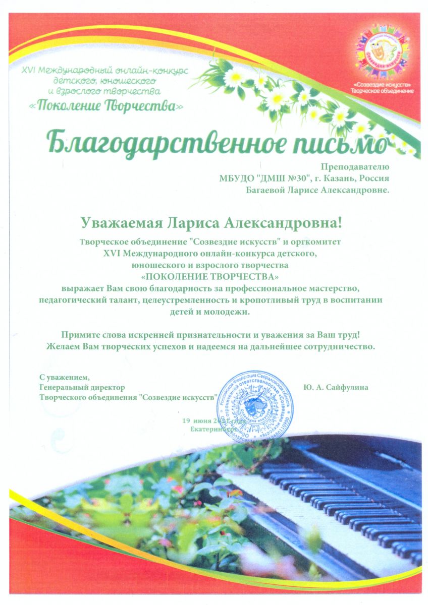 Международный конкурс искусств "Планета искусств" - Гараева С.А. - Благодарственное письмо