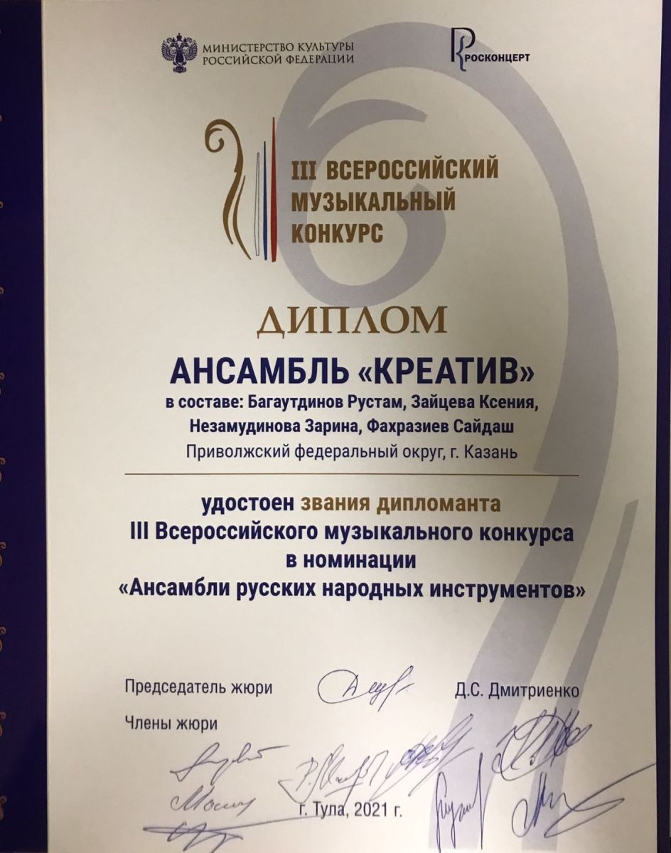 III Всероссийский музыкальный конкурс - Багаутдинов Р.А. в составе квартета "Креатив" - дипломант в номинации "Ансамбли русских народных инструментов"