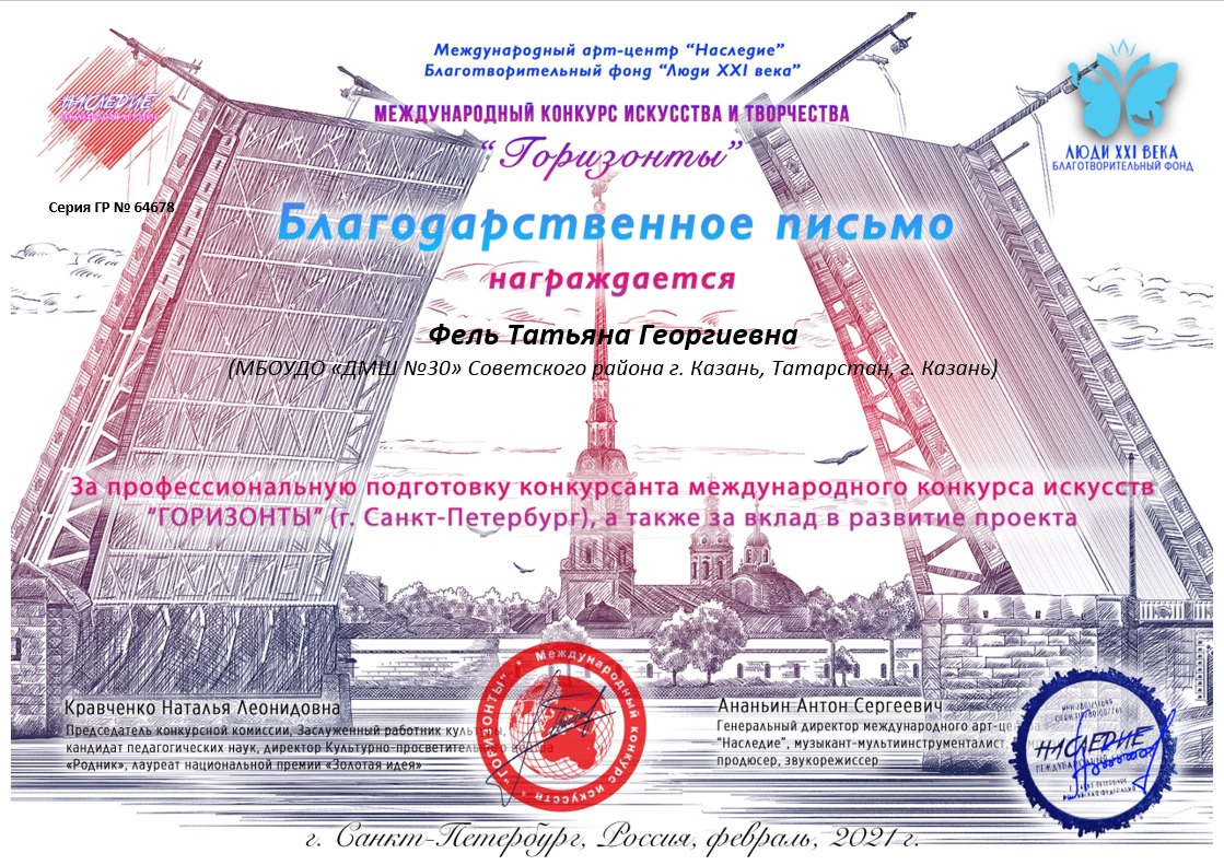 Международный конкурс искусства и творчества "Горизонты" - Фель Т.Г. - Благодарственное письмо