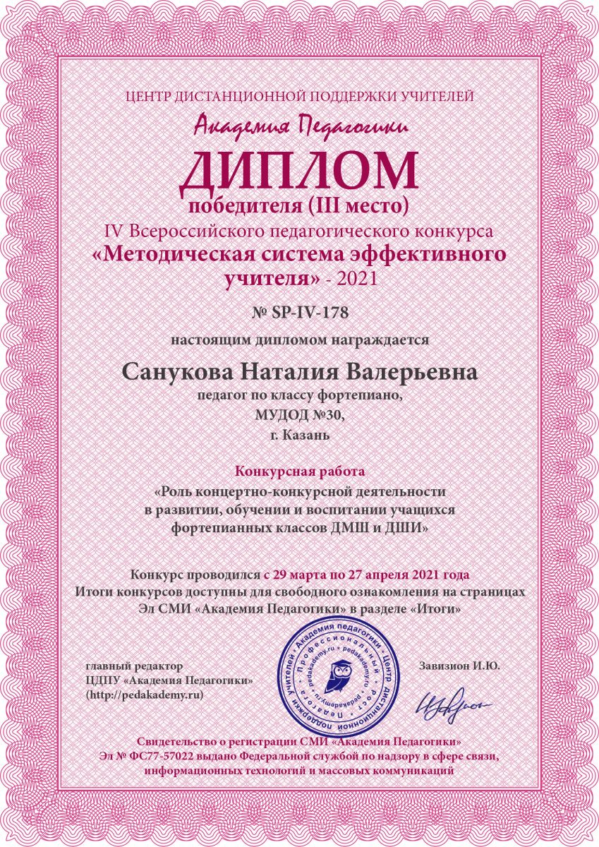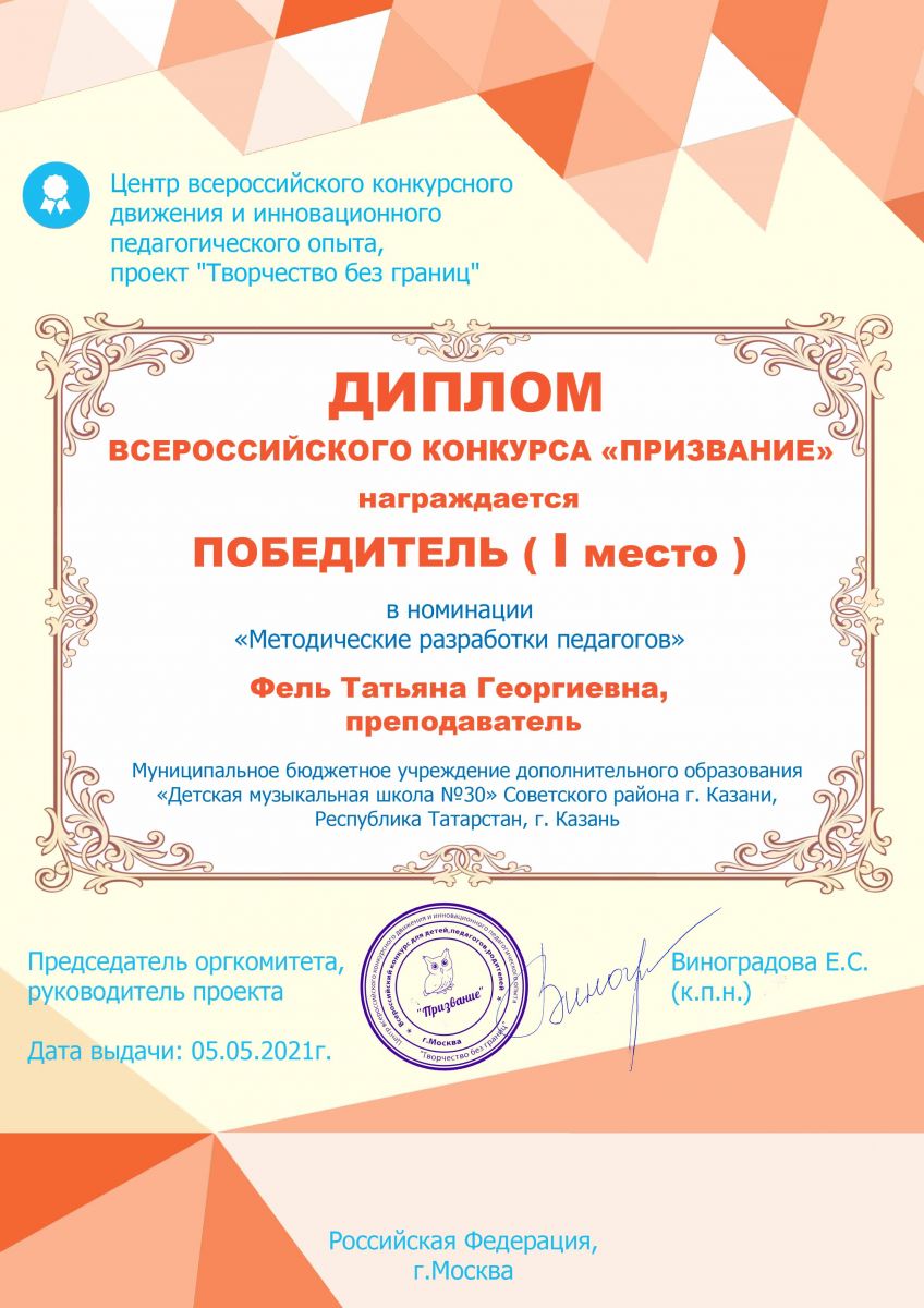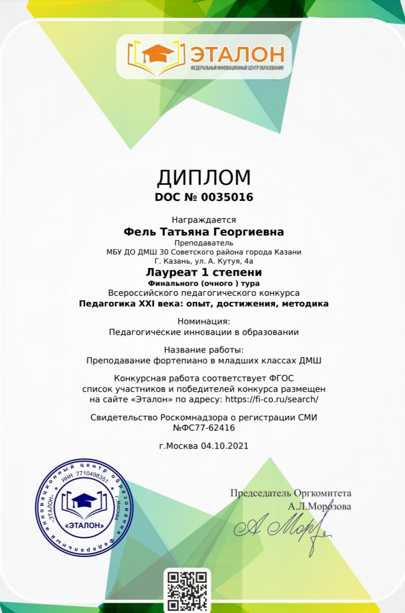 Всероссийский финальный (очный) педагогический конкурс "Педагогика XXI века: опыт, достижения, методика" - Фель Т.Г. - I место за работу "Преподавание фортепиано в младших классах"