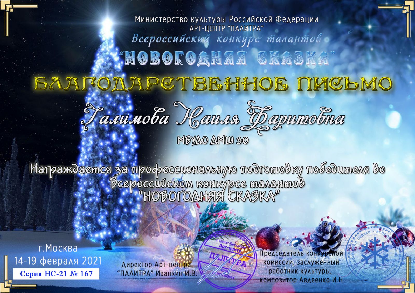Всероссийский конкурс талантов "Новогодняя сказка" - Галимова Н.Ф. - Благодарственное письмо