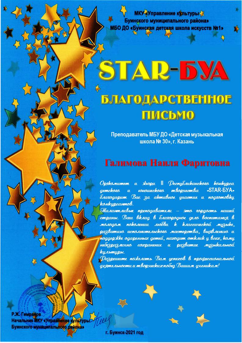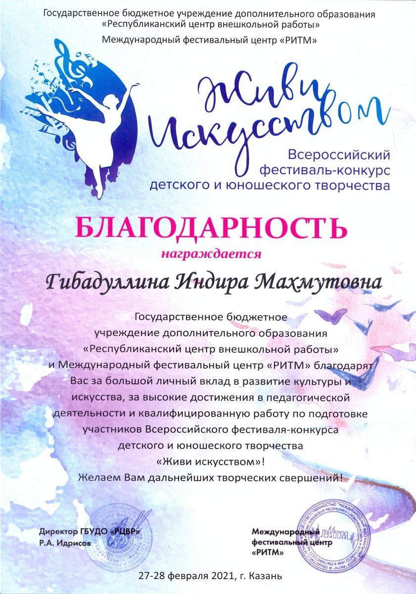 Всероссийский фестиваль-конкурс детского и юношеского творчества "Живи искусством" - Гибадуллина И.М. - Благодарность