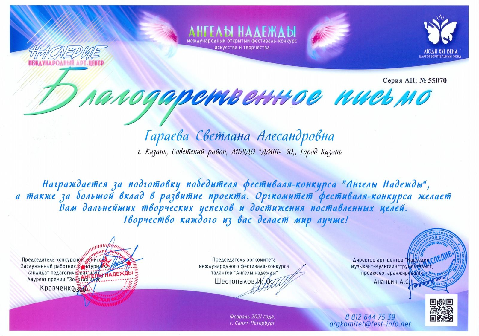 Международный открытый фестиваль-конкурс искусства и творчества "Ангелы надежды" - Гараева С.А.- Благодарственное письмо