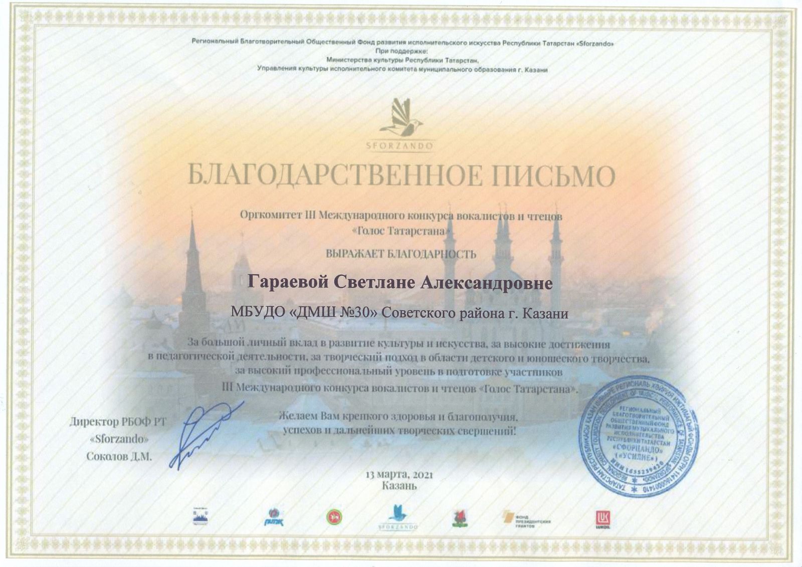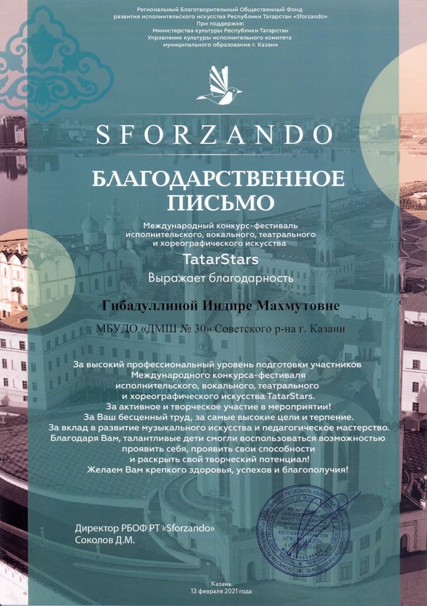 Международный конкурс-фестиваль исполнительского, вокального искусства "SFORZANDO" - Гибадуллина И.М. - Благодарственное письмо