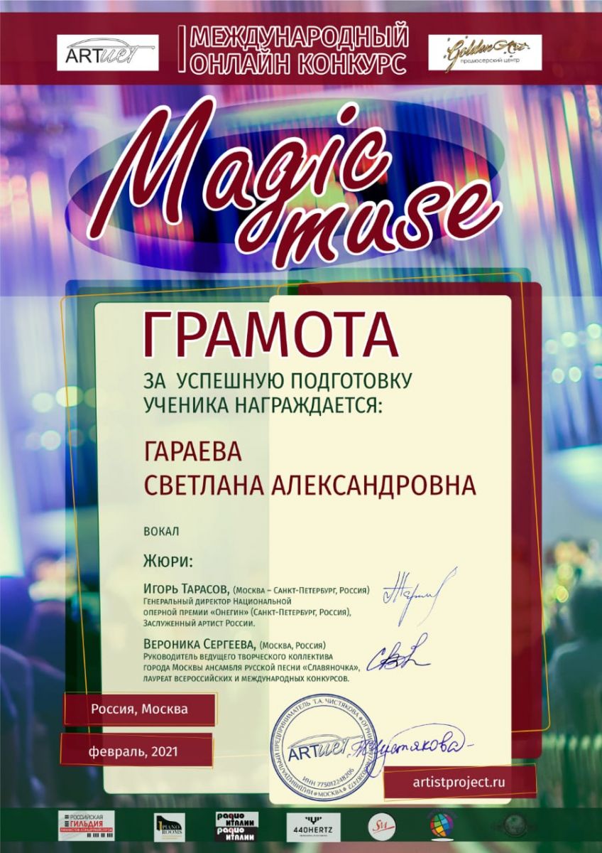 Международный онлайн-конкурс "Magic muse" - Гараева С.А. - Грамота