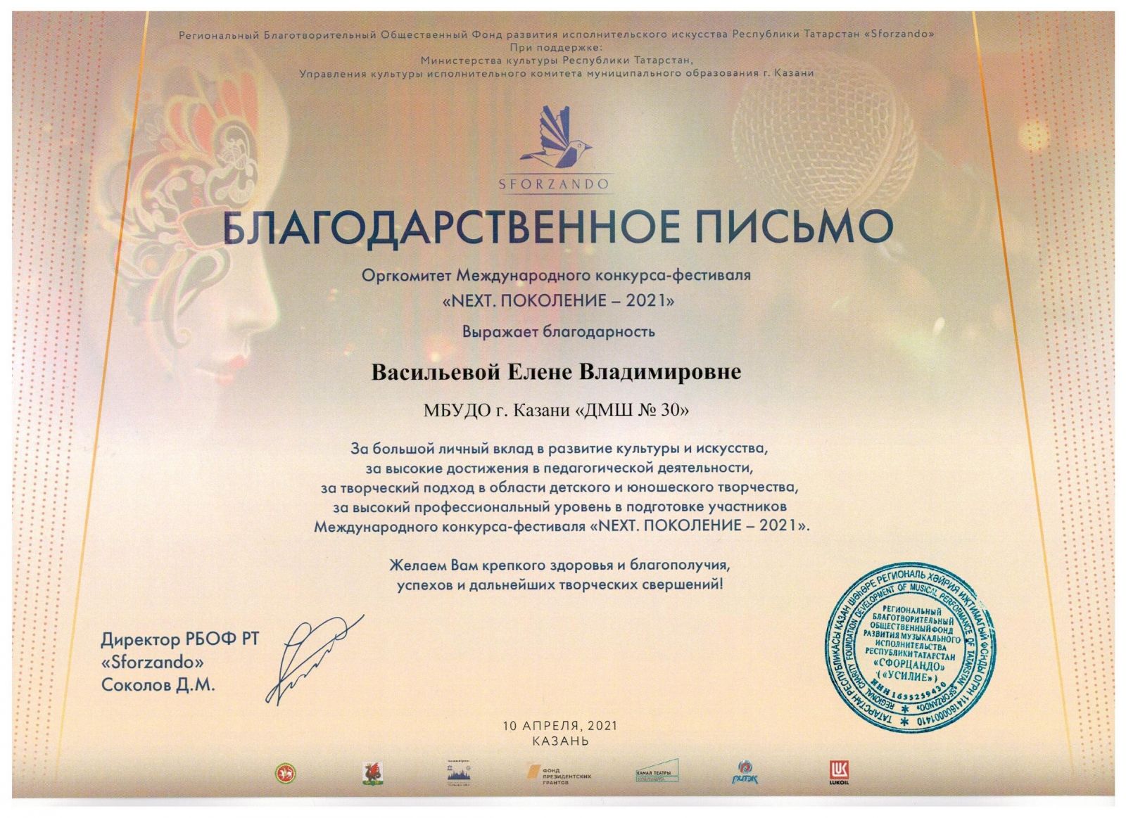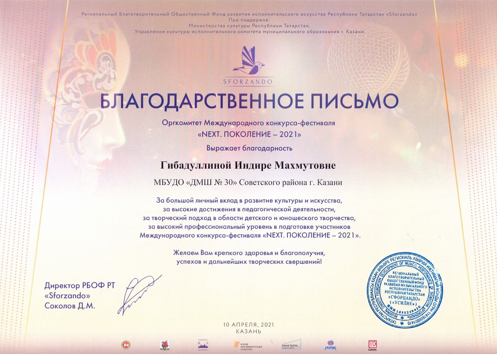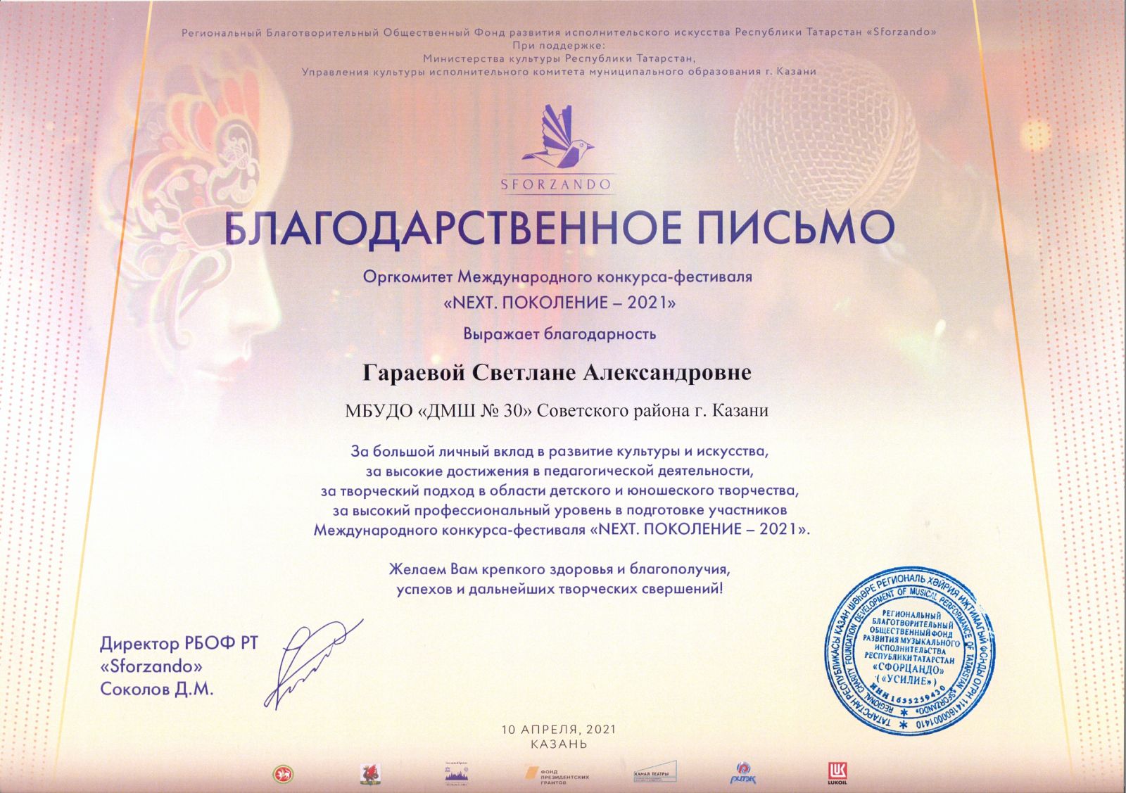 Международная музыкальная премия "SFORZANDO" - Комиссарова О.М. - Благодарственное письмо