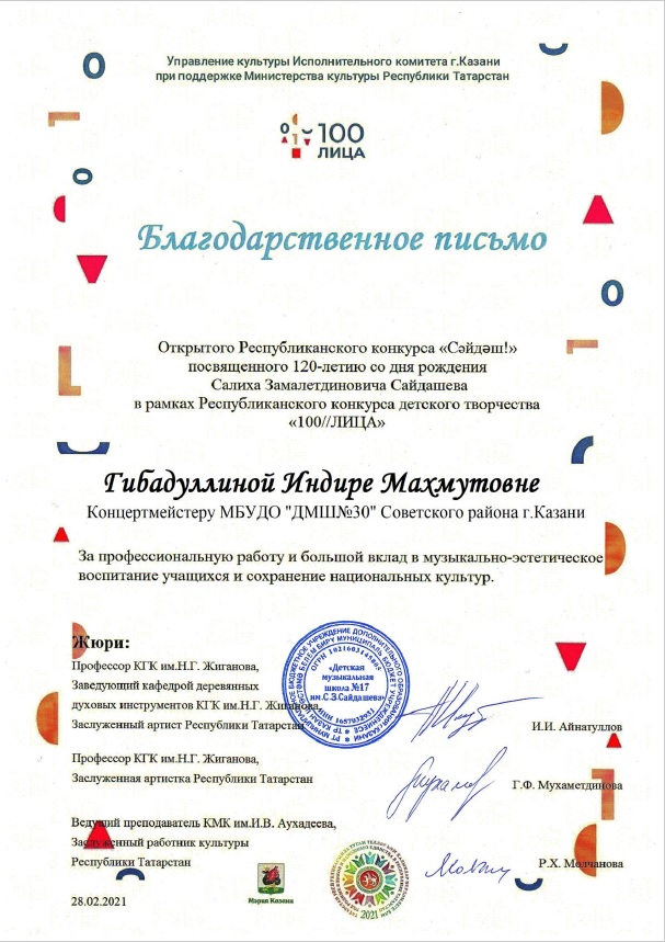 Открытый Республиканский конкурс "Сәйдәш!", посвященный 120-летию со дня рождения С.Сайдашева - Гибадуллина И.М. - Благодарственное письмо