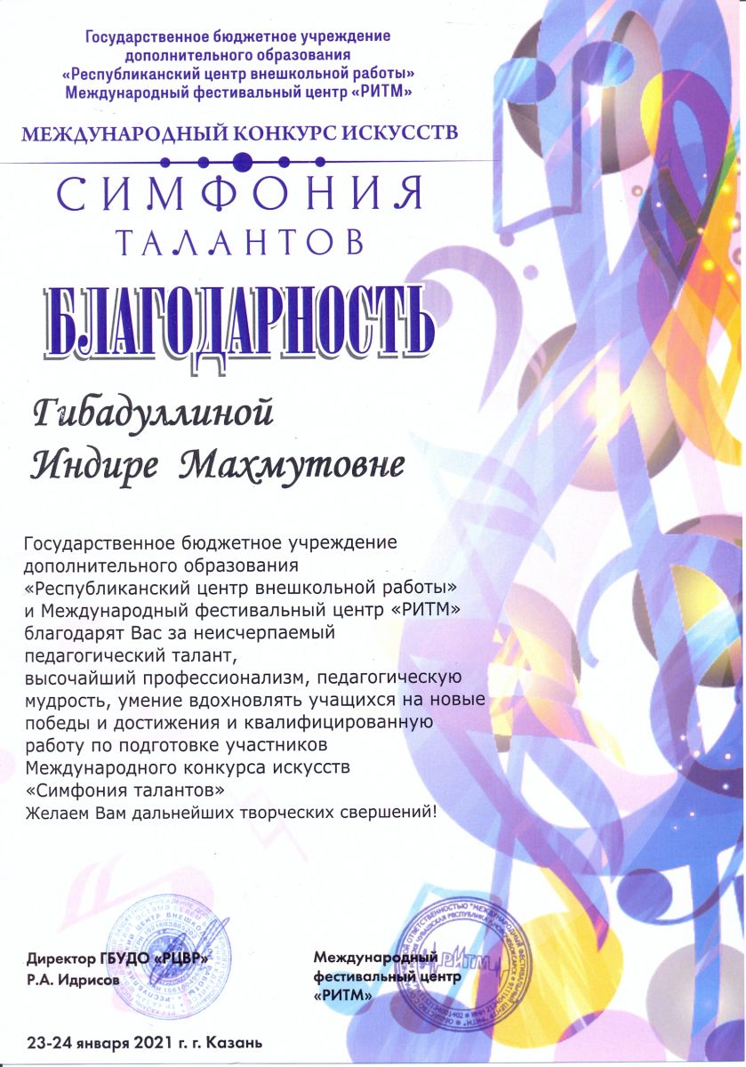 Международный конкурс искусств "Симфония талантов" - Гибадуллина И.М. - Благодарность