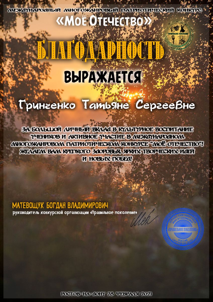 Международный многожанровый патриотический конкурс "Мое Отечество" - Гринченко Т.С. - Благодарственное письмо