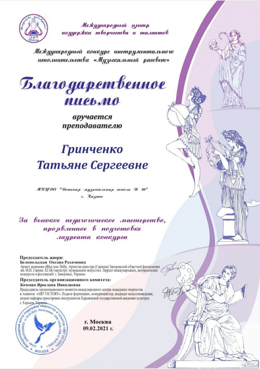 Международный конкурс инструментального искусства "GRAND MUSIC" - Гринченко Т.С. - Благодарственное письмо
