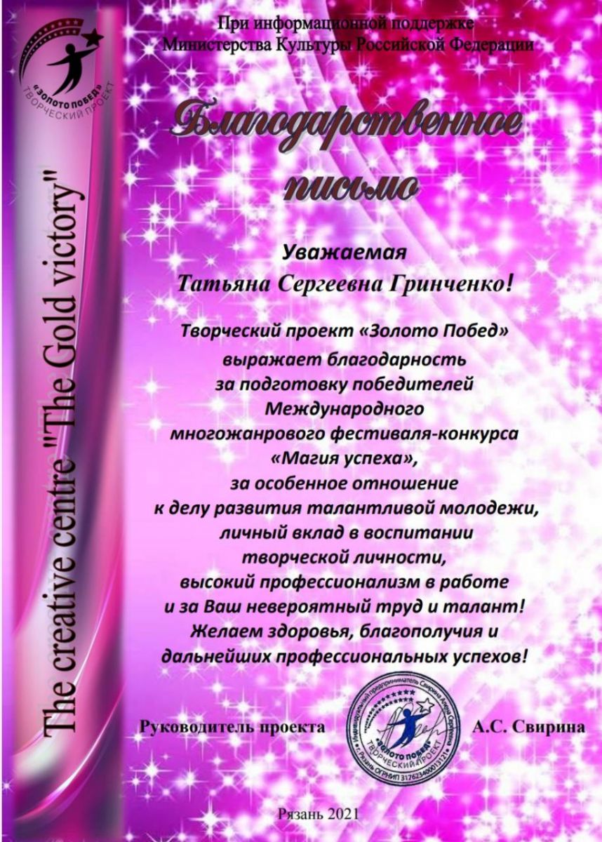 Международный многожанровый фестиваль-конкурс "Магия успеха" - Гринченко Т.С. - Благодарственное письмо