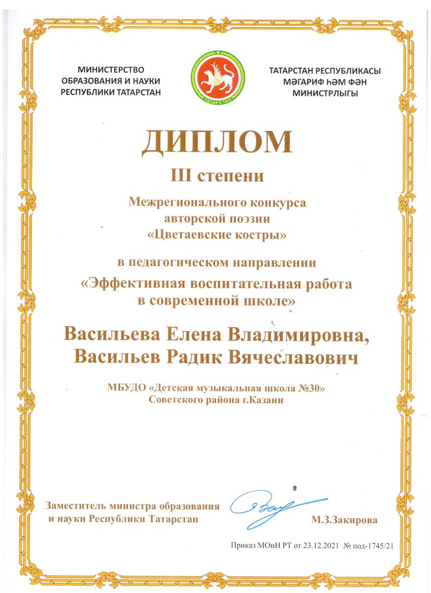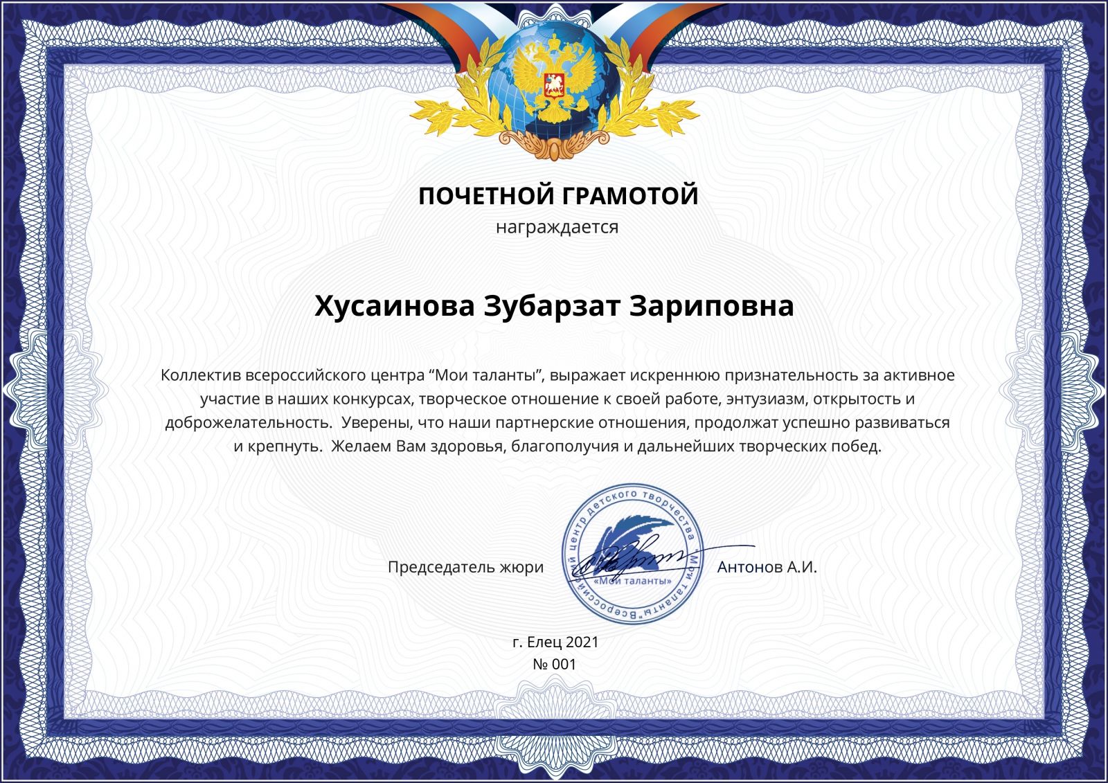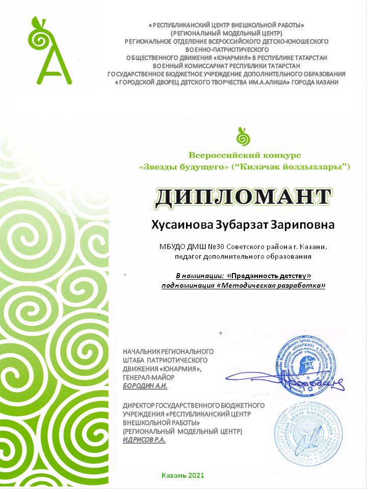 Всероссийский конкурс вокального и музыкального творчества "Мои таланты" - Хусаинова З.З. - Почетная грамота