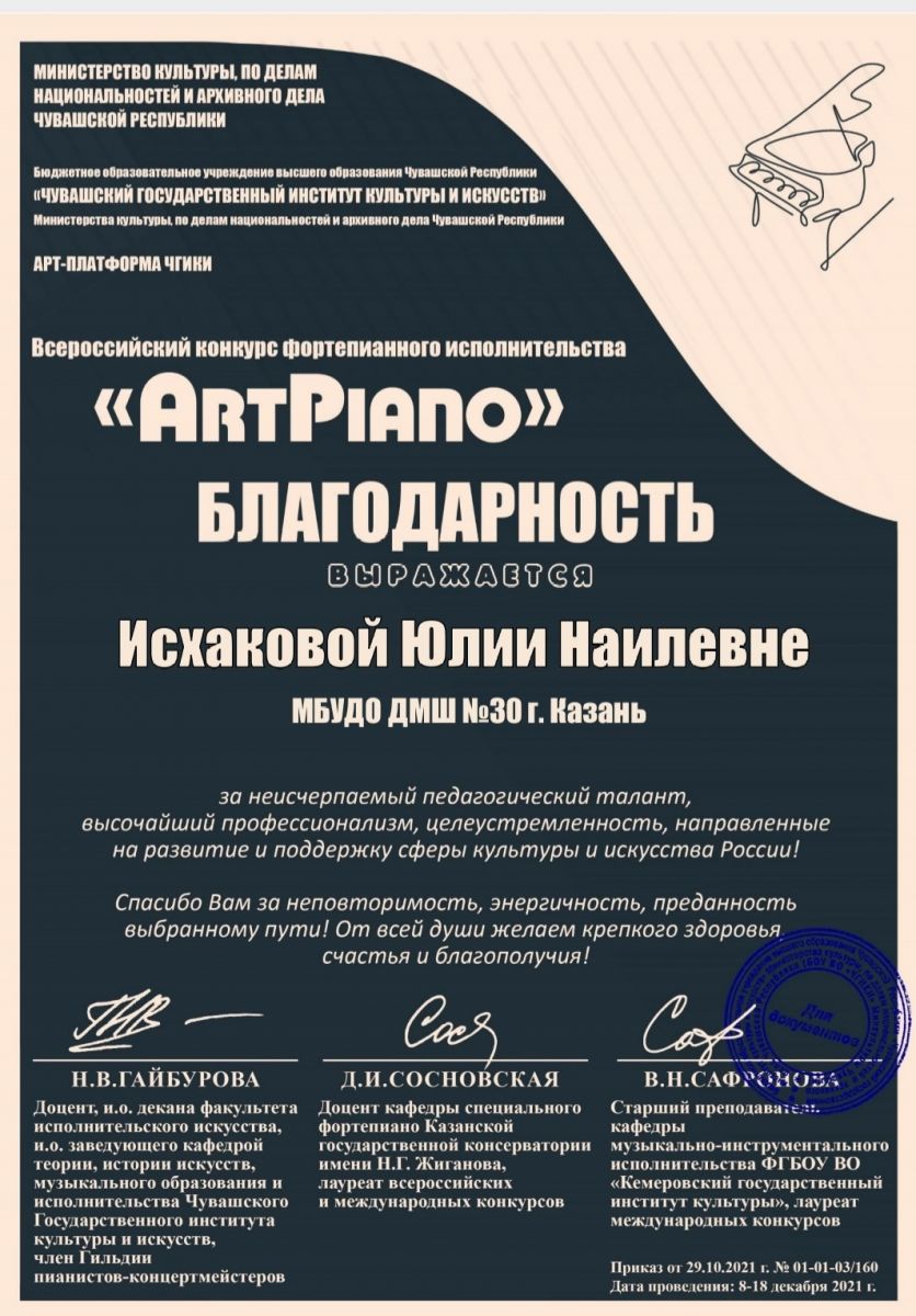Всероссийский конкурс фортепианного исполнительства "ART PIANO" - Исхакова Ю.Н. - Благодарственное письмо