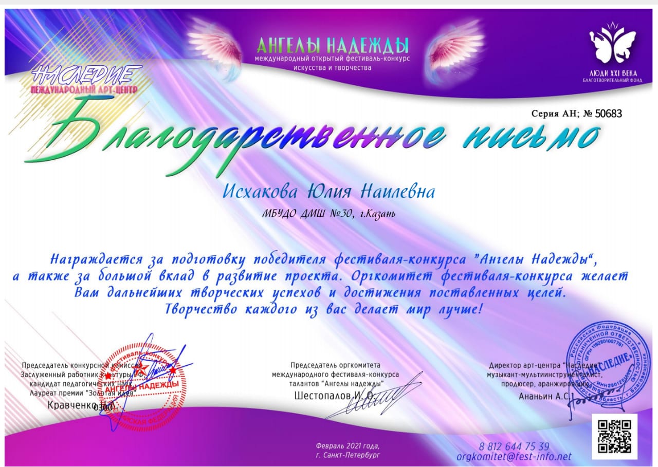 Международный открытый фестиваль-конкурс искусства и творчества "Ангелы надежды" - Исхакова Ю.Н.- Благодарственное письмо