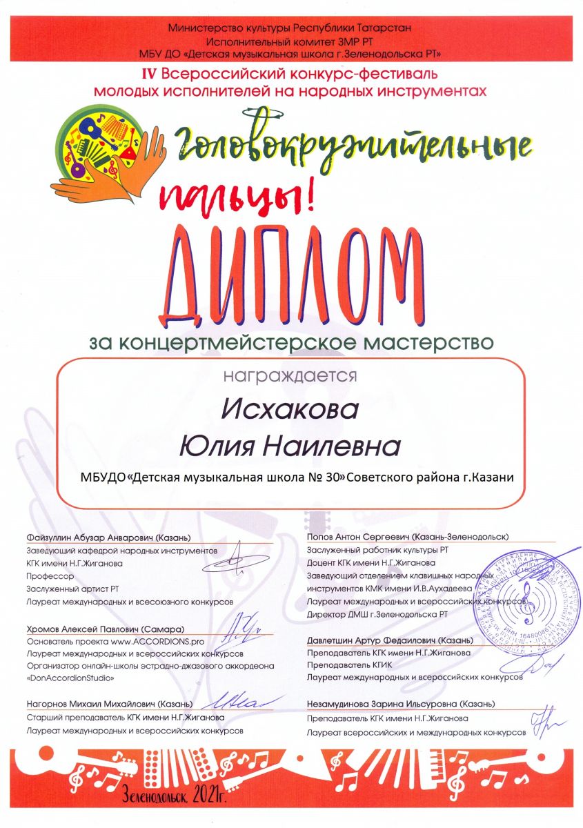 IV Всероссийский конкурс-фестиваль молодых исполнителей на народных инструментах "Головокружительные пальцы" - Исхакова Ю.Н. - диплом