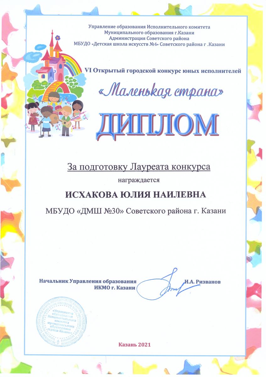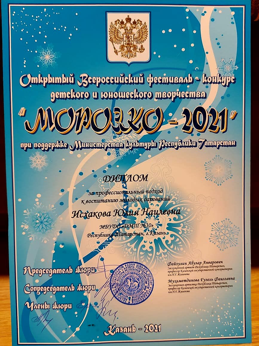 Открытый Всероссийский фестиваль-конкурс детского и юношеского творчества "Морозко-2021" - Исхакова Ю.Н. - Диплом