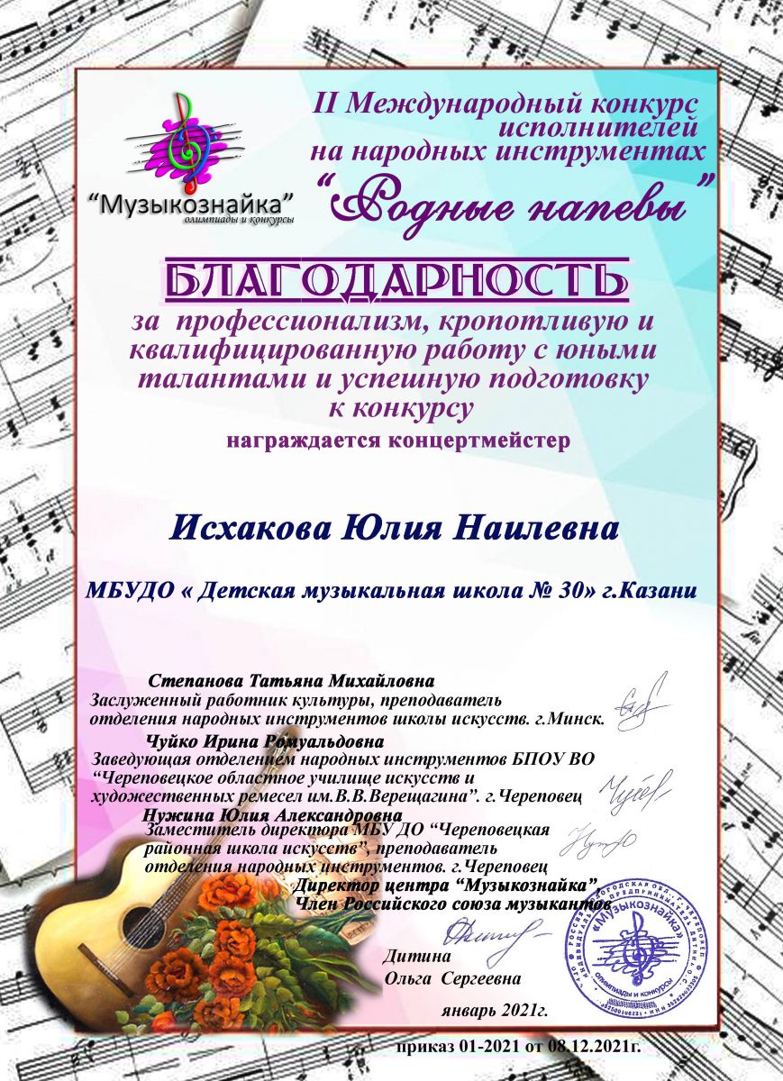 II Международный конкурс исполнителей на народных инсрументах "Родные напевы" - Исхакова Ю.Н. - Благодарственное письмо