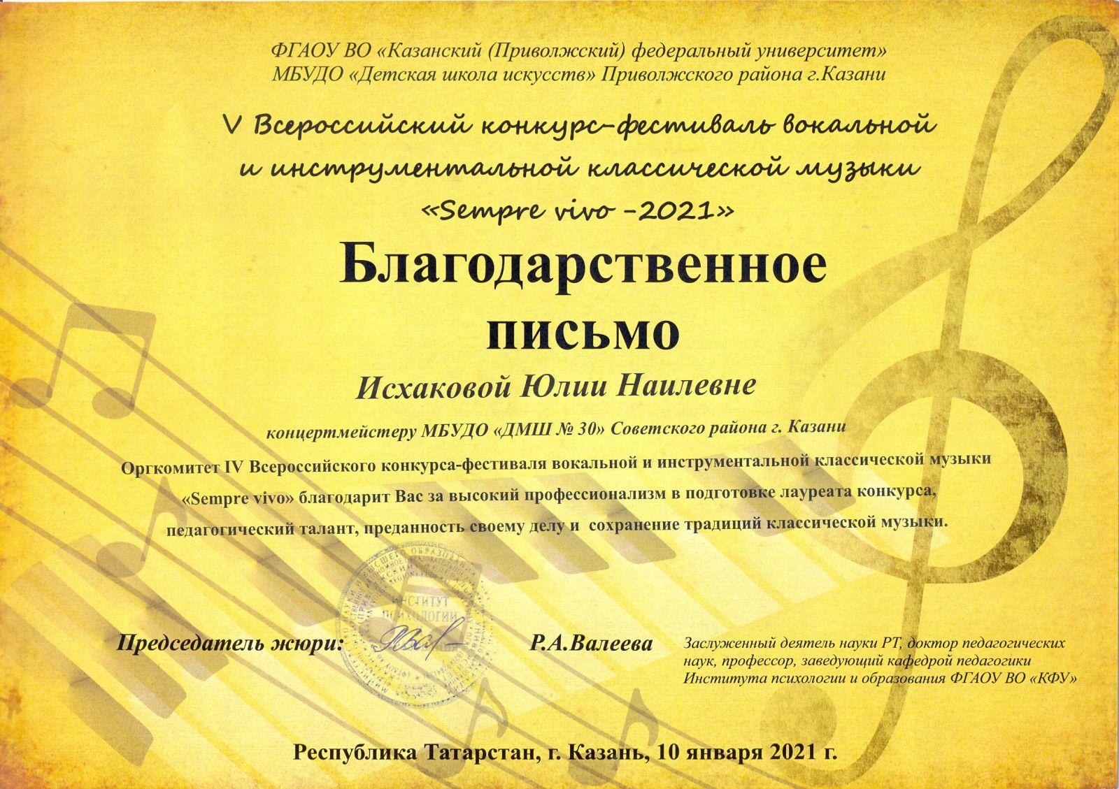 V Всероссийский конкурс-фествиаль вокальной и инструментальной классической музыки "Sempre vivo" - Исхакова Ю.Н. - Благодарственное письмо