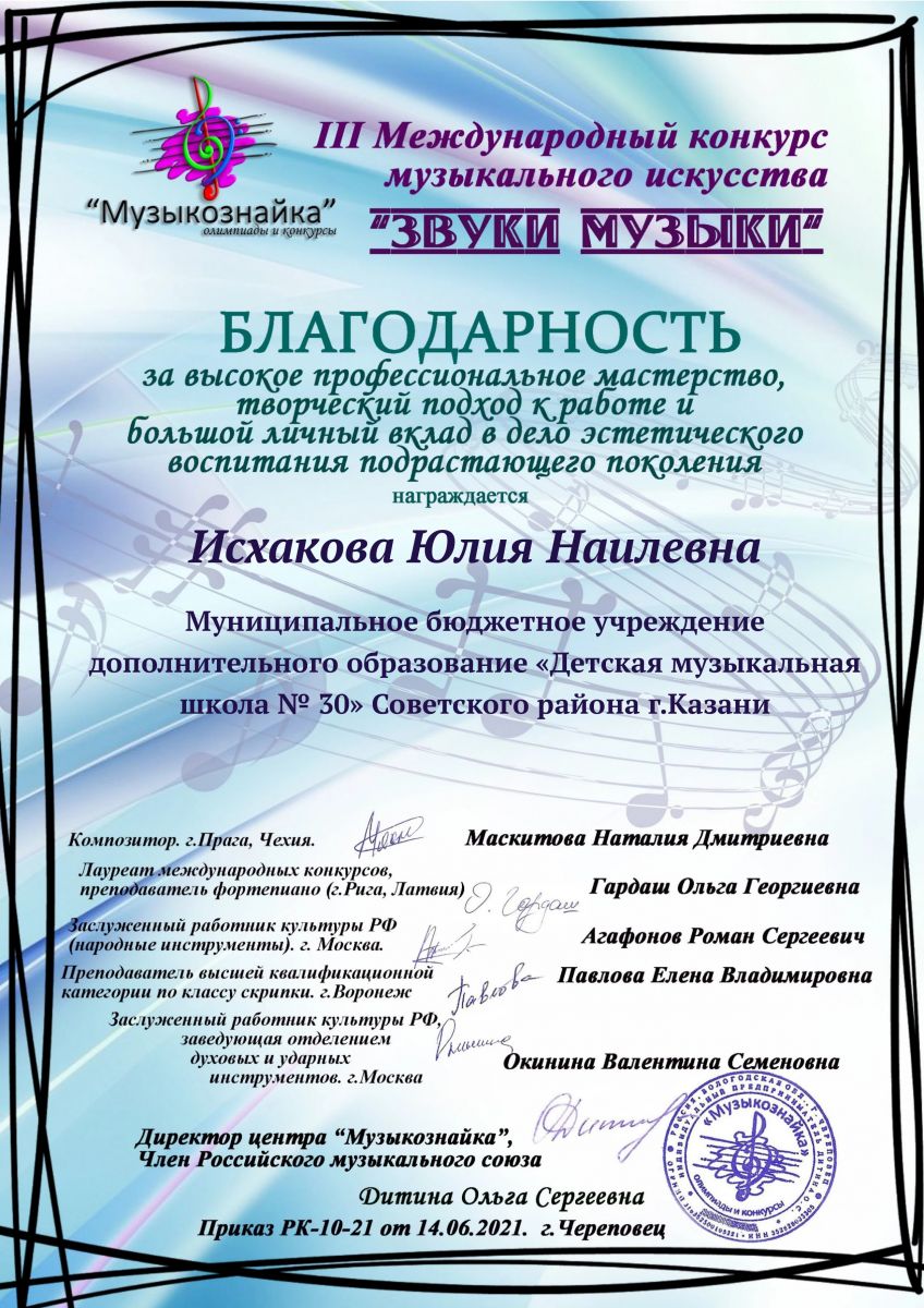 III Меджународный конкурс музыкального искусства "Звуки музыки" - Исхакова Ю.Н. - Благодарственное письмо