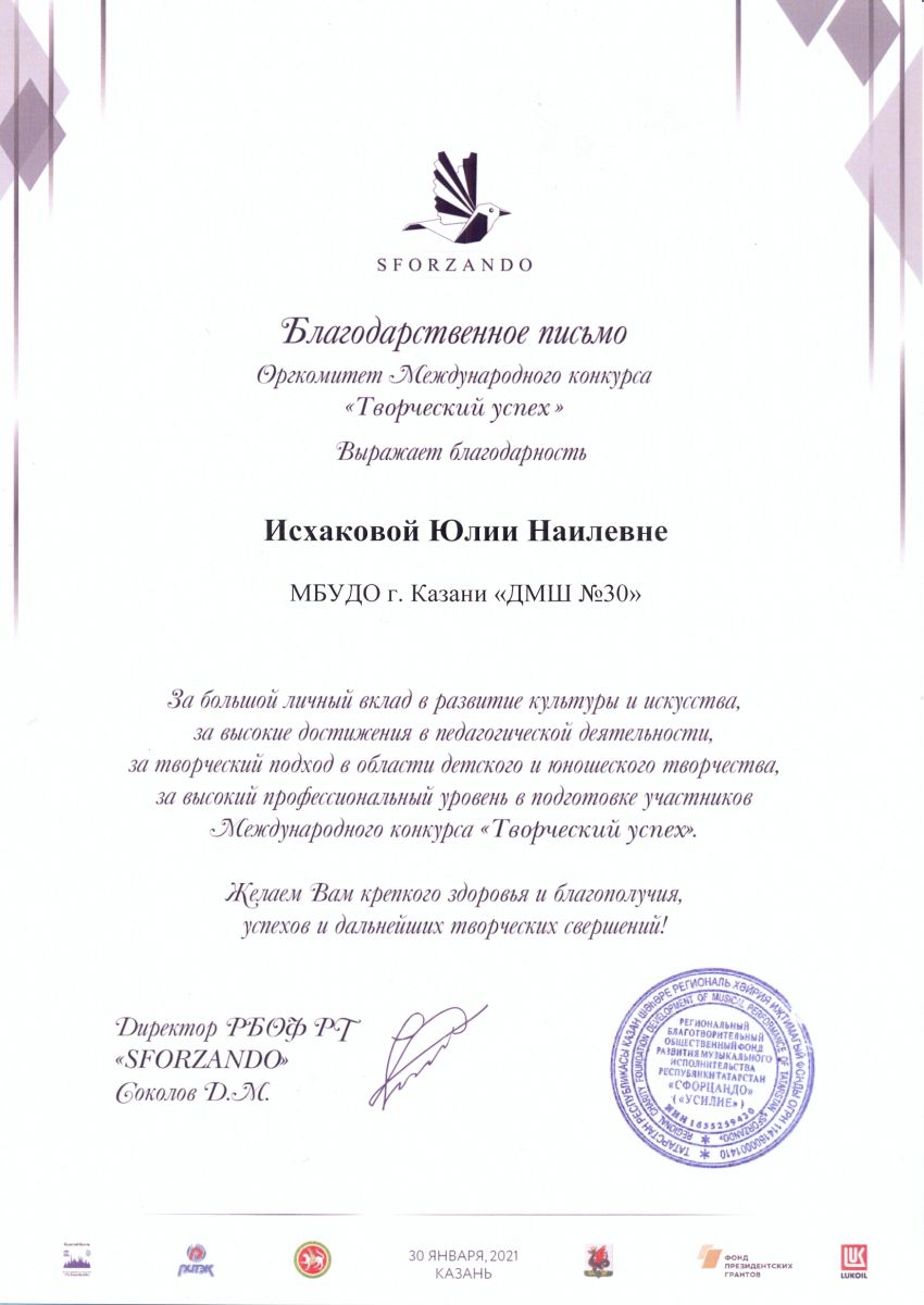 VI Республиканский конкурс исполнительского искусства "Forte" - Исхакова Ю.Н. - Благодарсвенное письмо