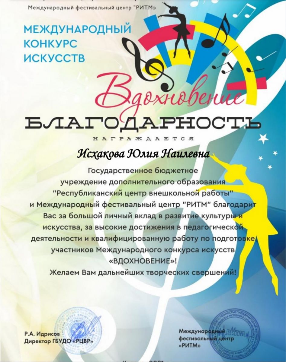 Международный конкурс искусств "Вхохновение" - Галимова Н.Ф. - Благодарность
