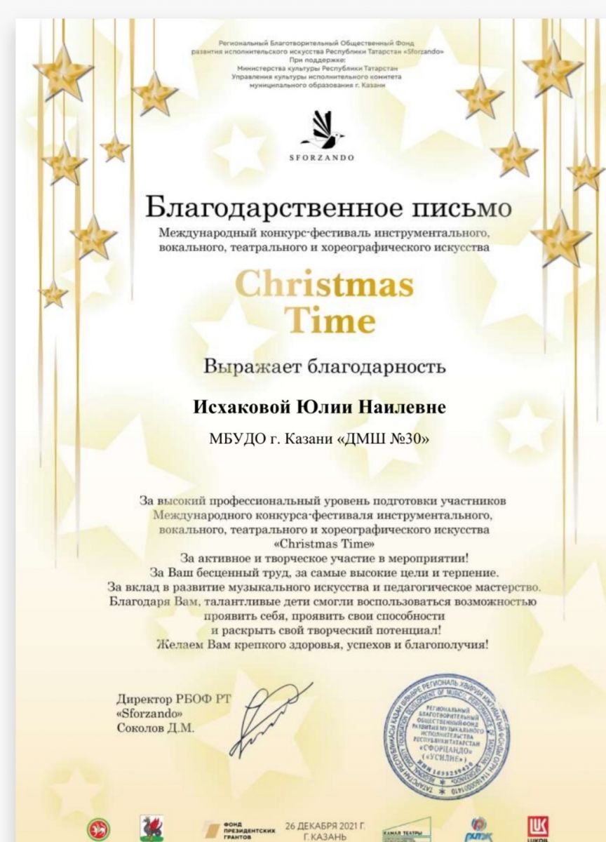 Международный конкурс-фестиваль инструментального, вокального, театрального и хореографического искусства "Christmas Time" - Исхакова Ю.Н. - Благодарственное письмо