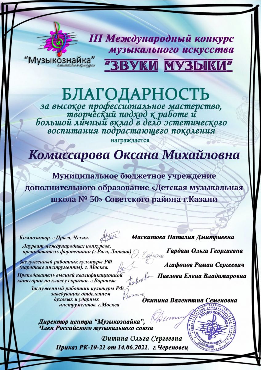 III Меджународный конкурс музыкального искусства "Звуки музыки" - Комиссарова О.М. - Благодарственное письмо