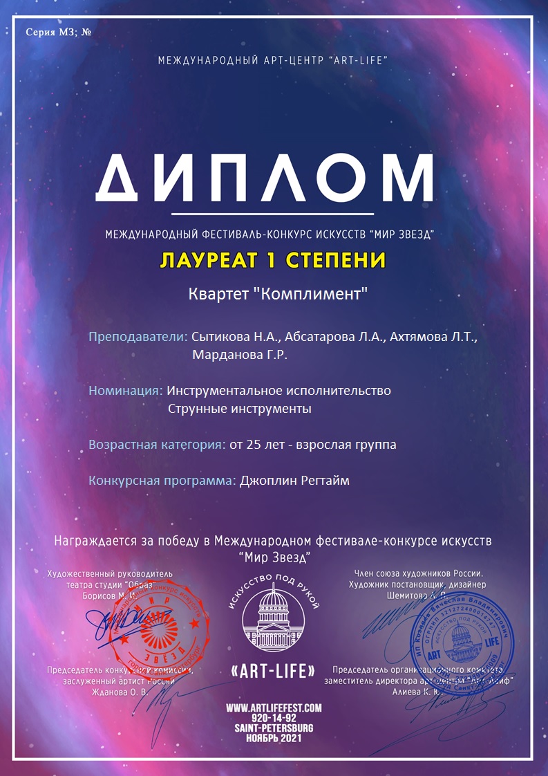 Международный фестиваль-конкурс искусств "Мир звезд" - квартет "Комплимент" - I место