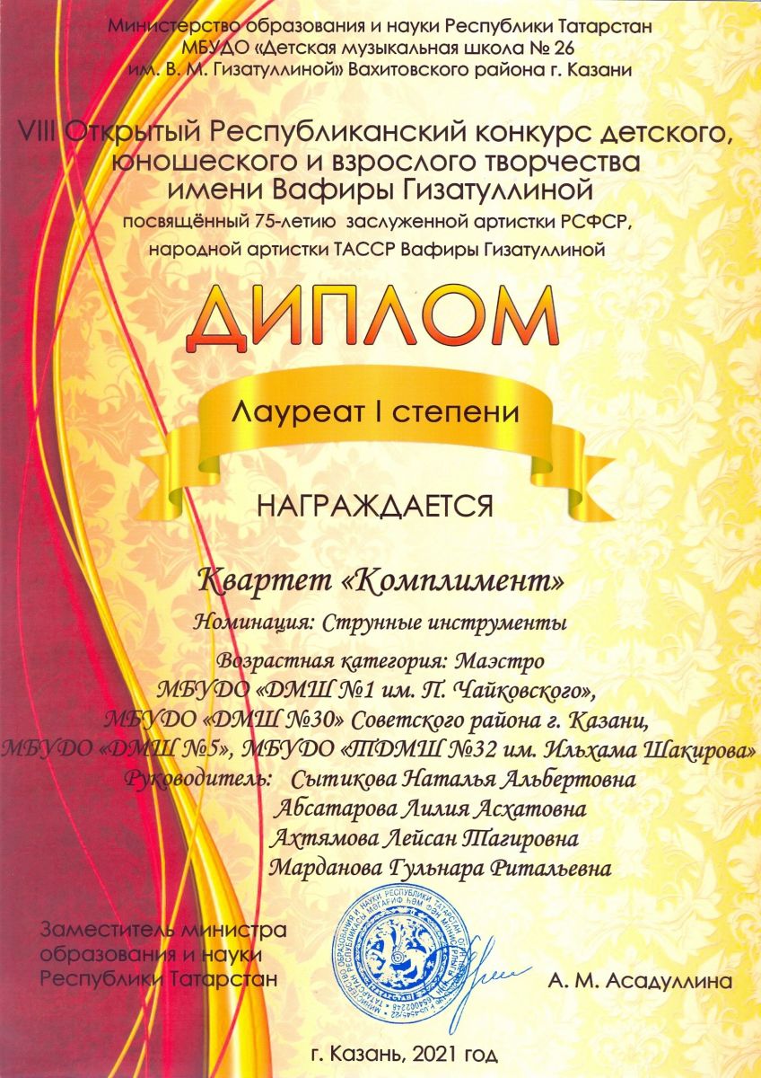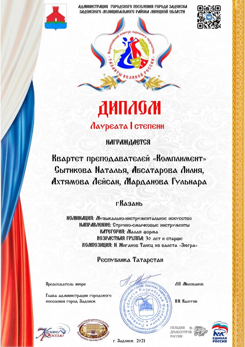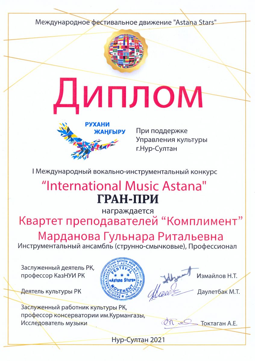 I Международный вокально-инструментальный конкурс "International Music Astana" - Марданова Г.Р.  в составе квартета преподавателей "Комплимент" - Гран-при