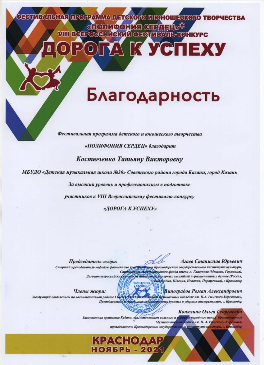 VIII Всероссийский фестиваль-конкурс "Дорога к успеху" - Костюченко Т.В. - Благодарственное письмо