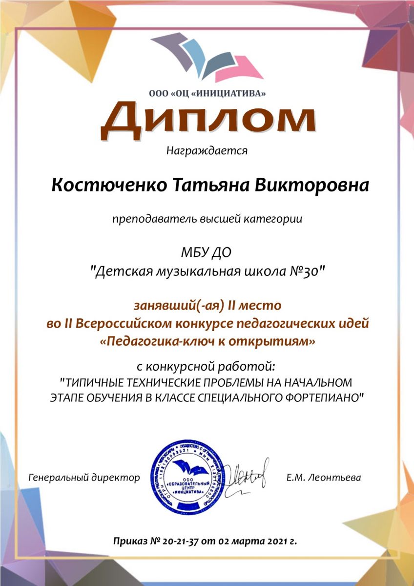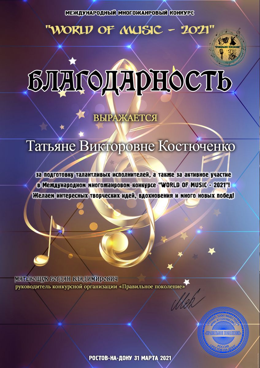 I Международный многопрофильный конкурс "Музыкальный экспресс-2021" - Костюченко Т.В. - Благодарность