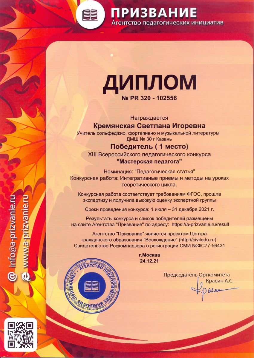 XIII Всероссийский педагогический конкурс "Мастерская педагога" - Кремянская С.И. - I место