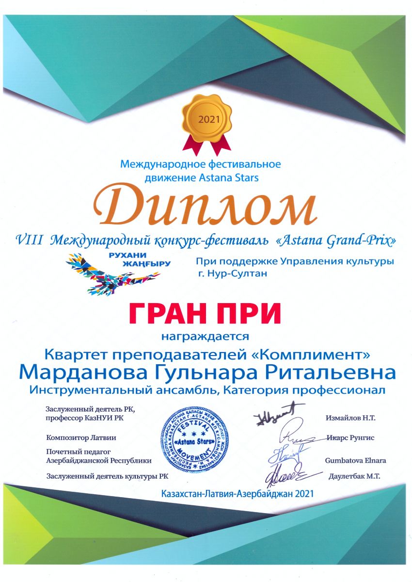 VIII Международный конкурс-фестиваль "Astana Grannd-Prix" - квартет "Комплмент" Марданова Г.Р. - гран - при