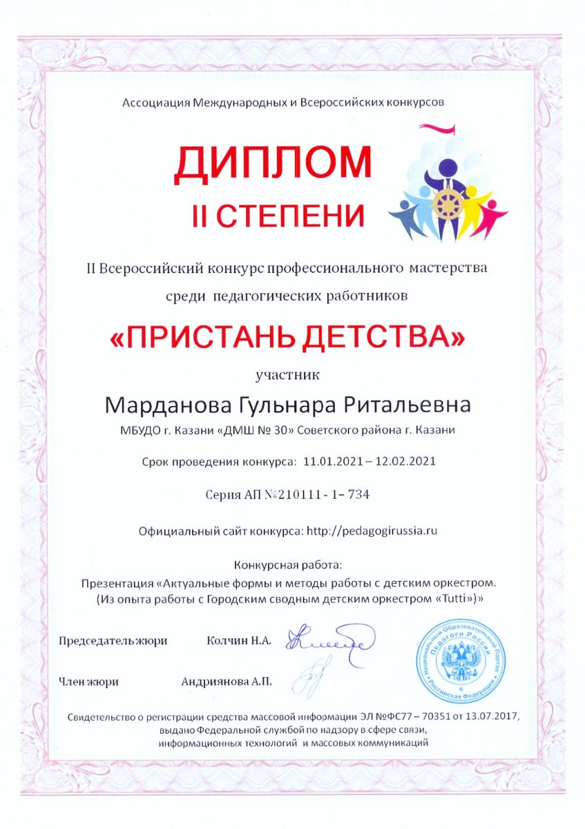 II Всероссийский конкурс профессионального мастерства среди педагогических работников "Пристань детства" - Марданова Г.Р. - диплом II степени