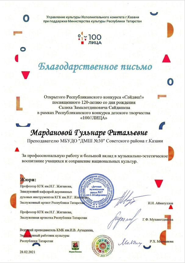 Открытый Республиканский конкурс "Сәйдәш!", посвященный 120-летию со дня рождения С.Сайдашева - Марданова Г.Р. - Благодарственное письмо