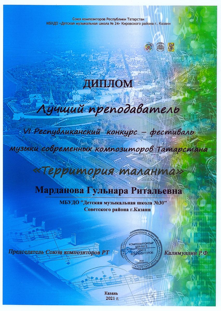 VI Республиканский конкурс-фестиваль музыки современных композиторов Татарстана "Территория таланта" - Марданова Г.Р. - диплом Лучший преподаватель