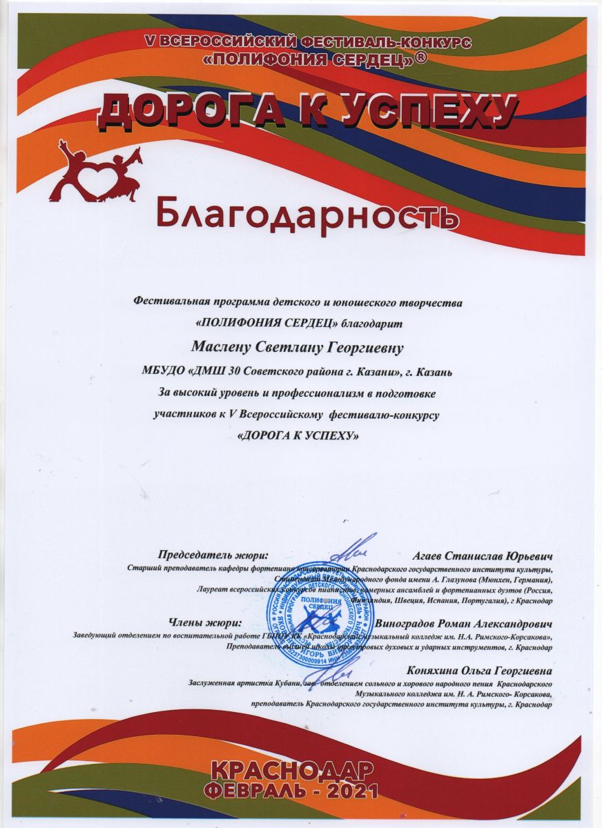 V всероссийский фестиваль-конкурс "Полифония сердец"/ "Дорога к успеху" - Маслена С.Г. - Благодарность