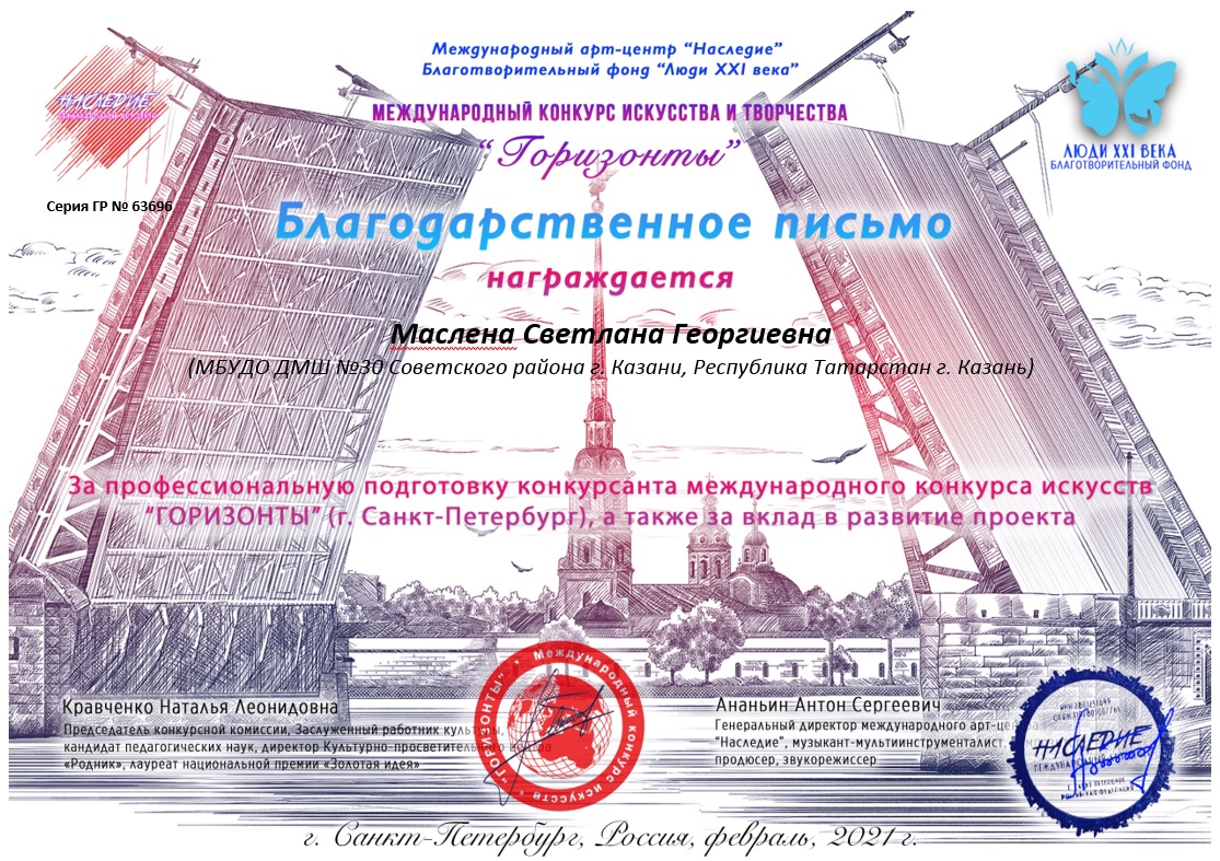 Международный конкурс искусства и творчества "Горизонты" - Маслена С.Г. - Благодарственное письмо