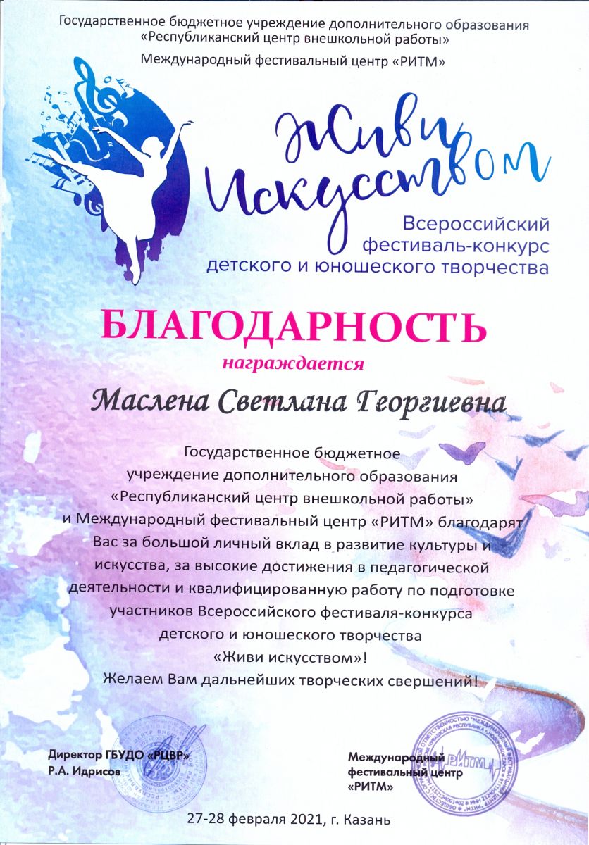 Всероссийский фестиваль-конкурс детского и юношеского творчества "Живи искусством" - Маслена С.Г. - Благодарность