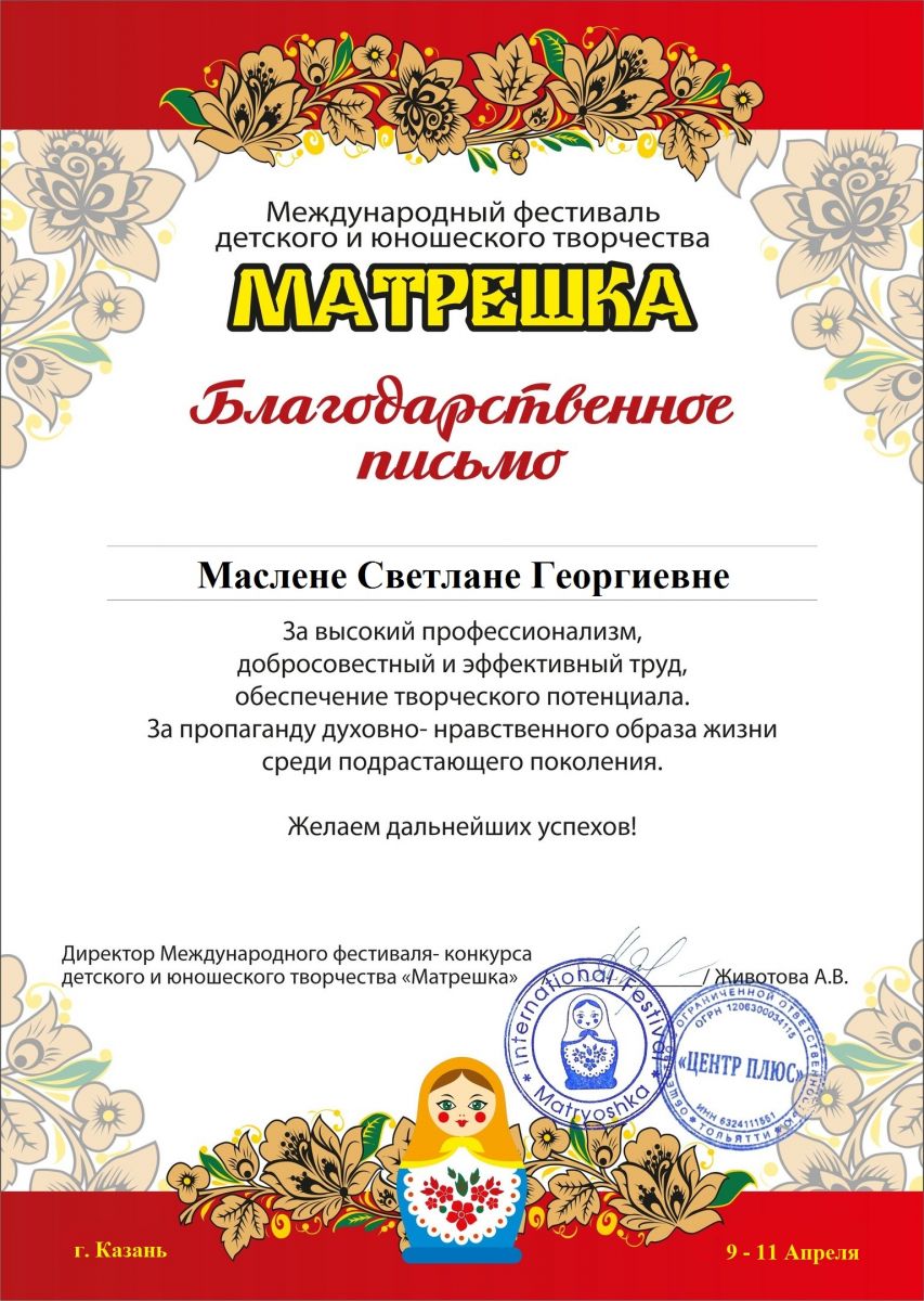 Международный фестиваль-конкурс "Золотая лира" - Маслена С.Г.- Благодарствекнное письмо