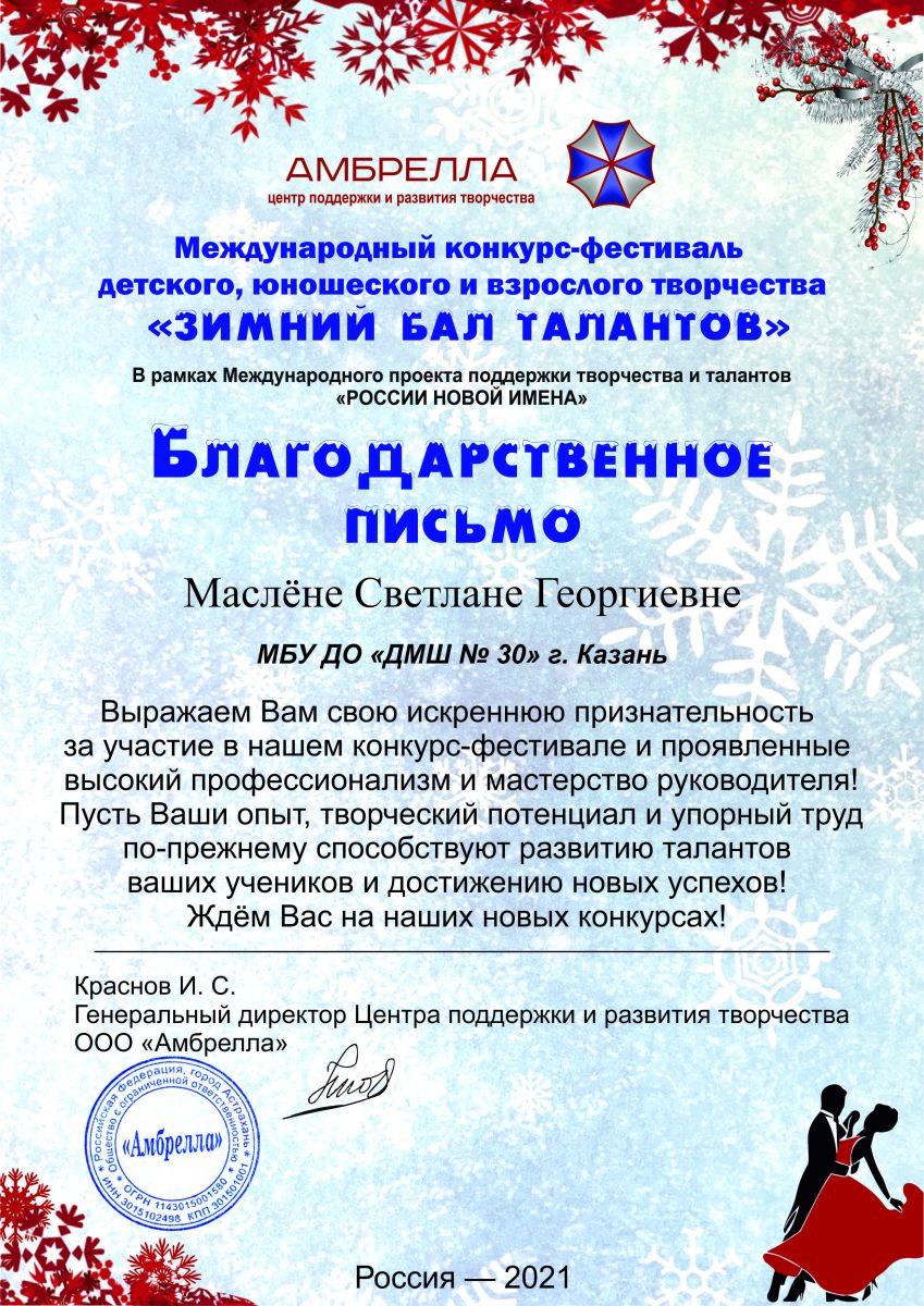 Международный конкурс-фестиваль детского, юношеского и взрослого творчества "Зимний бал талантов" - Маслена С.Г. - Благодарственное письмо