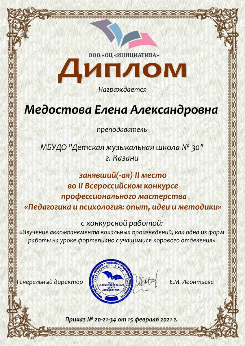 II Всероссийский конкурс профессионального мастерства "Педагогика и психология: опыт, идеи и методики" - Медостова Е.А.- диплом