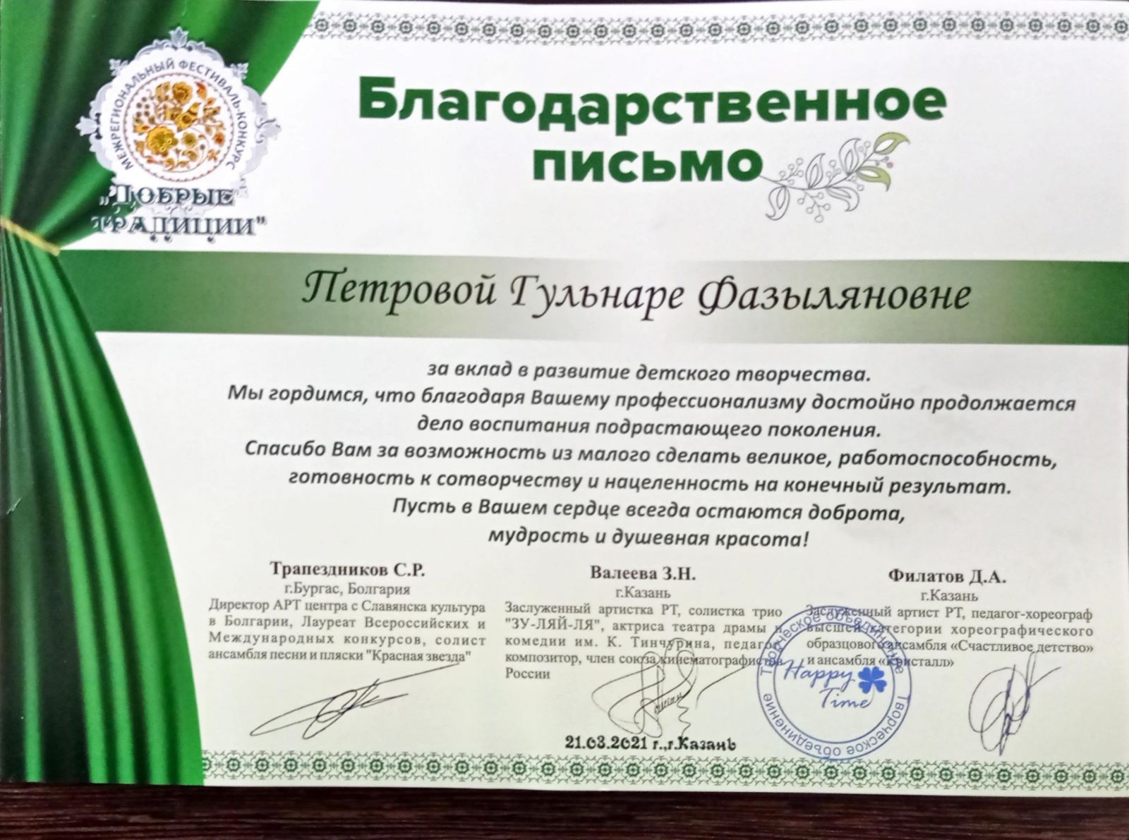 Международный фестиваль-конкурс искусств "Ветер перемен" - Хусаинова З.З. - Благодарственное письмо