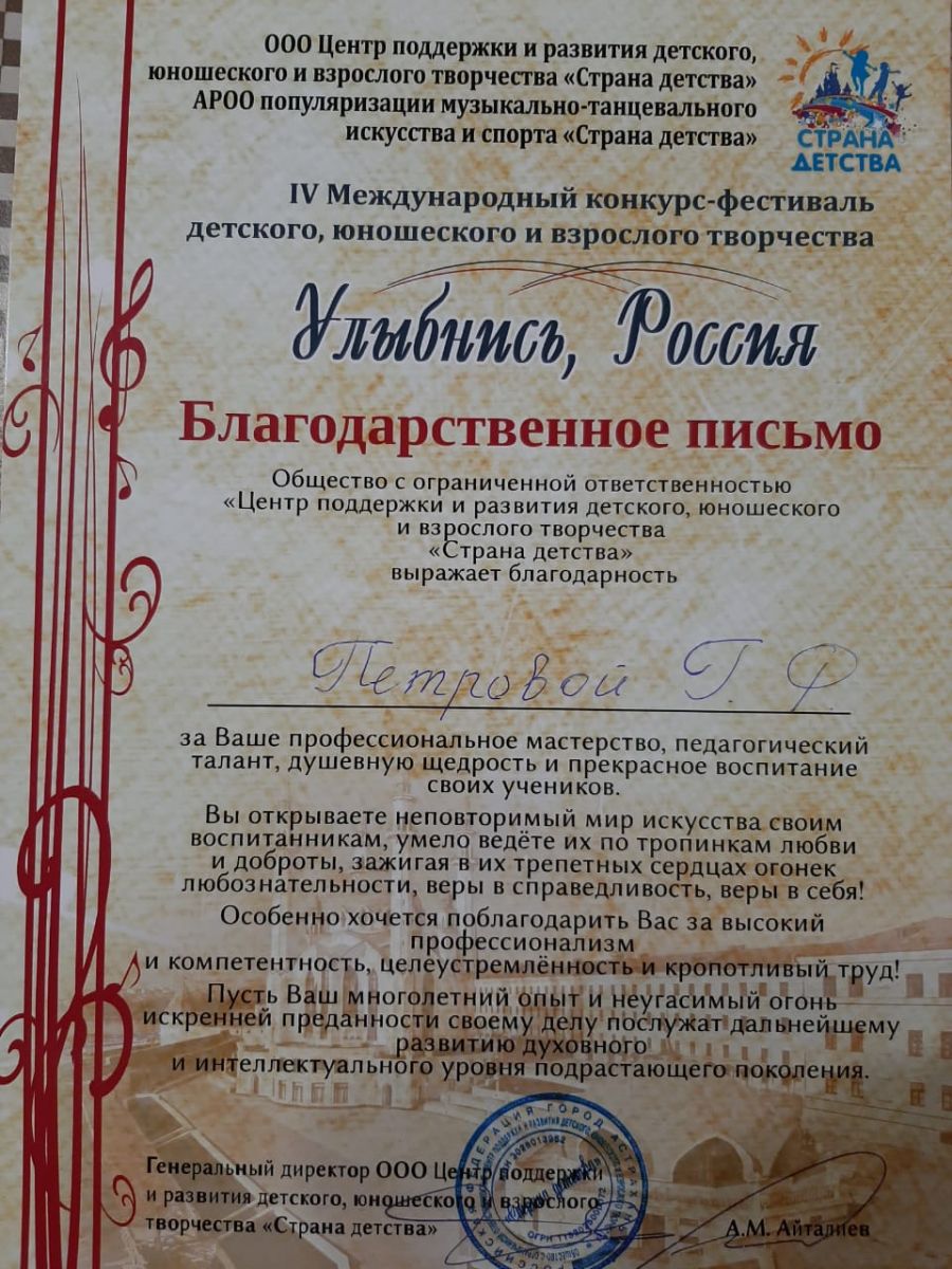 IV Международный конкурс-фестиваль детского, юношеского и взрослого творчества "Улыбнись, Россия" - Петрова Г.Ф. - Благодарственное письмо