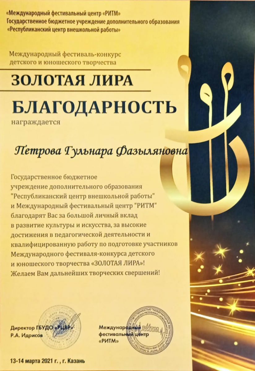 Международный фестиваль-конкурс "Золотая лира" - Гринченко Т.С. - Благодарственное письмо