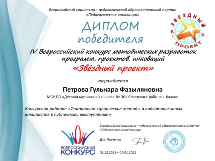IV Всероссийский конкурс методических разработок, программ, проектов, инноваций "Звездный проект" - Петрова Г.Ф. - диплом победителя за конкурсную работу "Театрально-сценические методы в подготовке юных вокалистов к публичному выступлению"