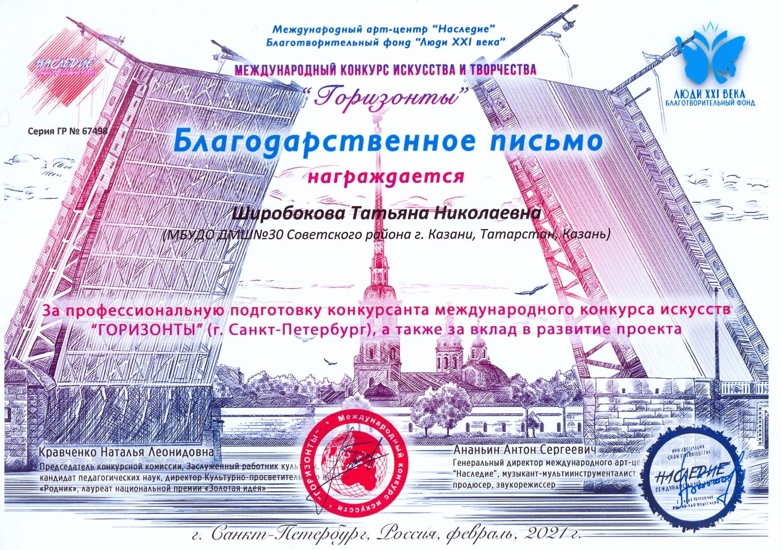 Международный конкурс искусства и творчества "Горизонты" - Шарафеева А.А. - Благодарственное письмо
